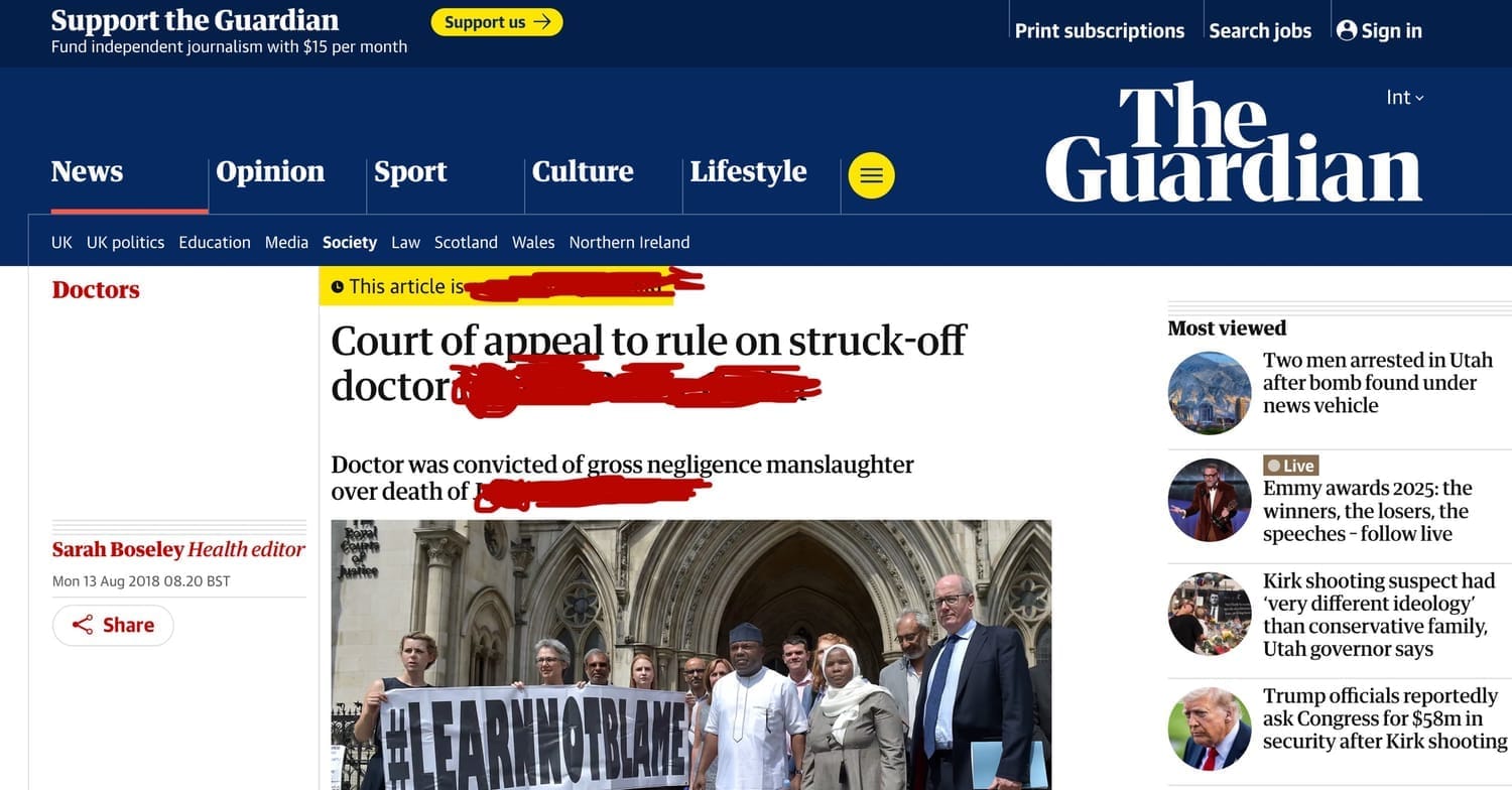 The British Medical Journal and the Guardian UK recently published a story of a UK Paediatrician who was jailed because of a fatal error she made that caused the death of a patient.