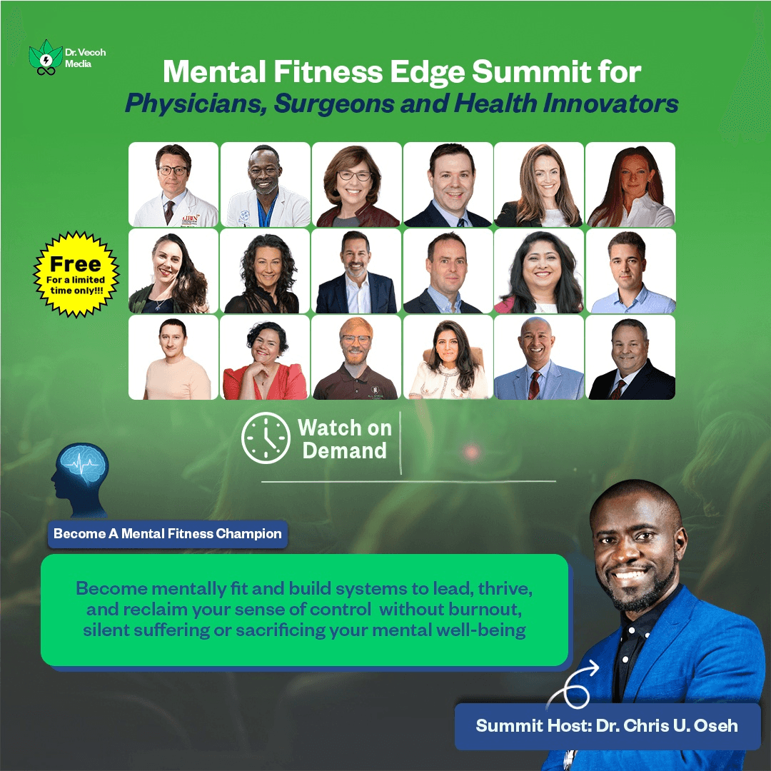 He empowers physicians, healthcare leaders, and health tech founders to build mental fitness, emotional resilience, and healthy stress coping habits for high work performance.